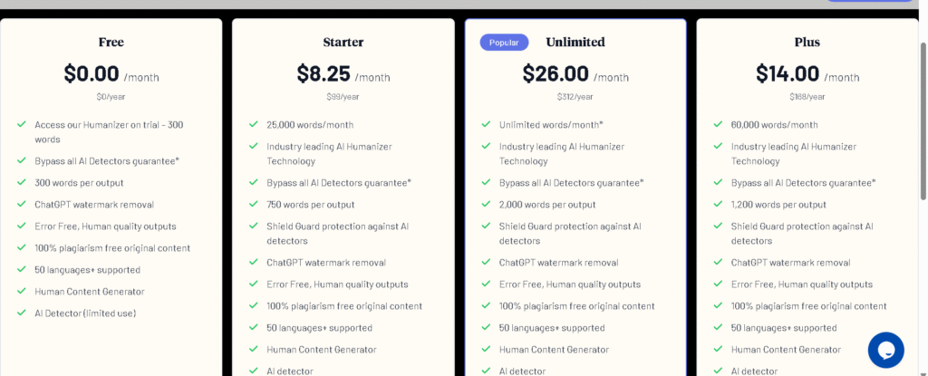Well-known brands and heavy users will love the Pro Plan. This plan offers the highest word limits and maximum possibilities to bypass the detector. Smaller scale users can save money with free and Starter Plans that still cover basic needs without breaking the bank. You can easily scale up or down, you won’t be locked into anything you don’t need.