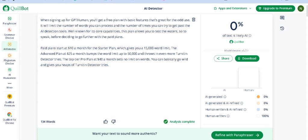 Compared to others, GPTHuman’s reliability stands out with consistent results across the board. Its output is always top-notch, from short essays to complex documents, and suitable for students, writers, and experts.