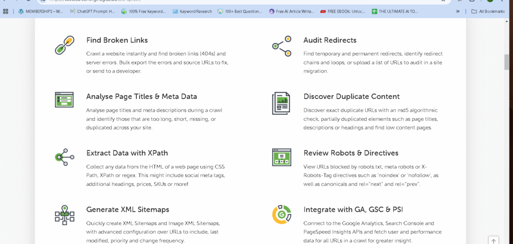 It trawls websites for problems such as broken links, duplicate content, absence of metadata, and slow loading pages.